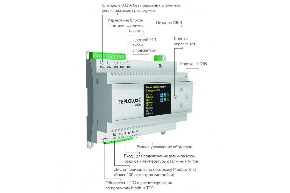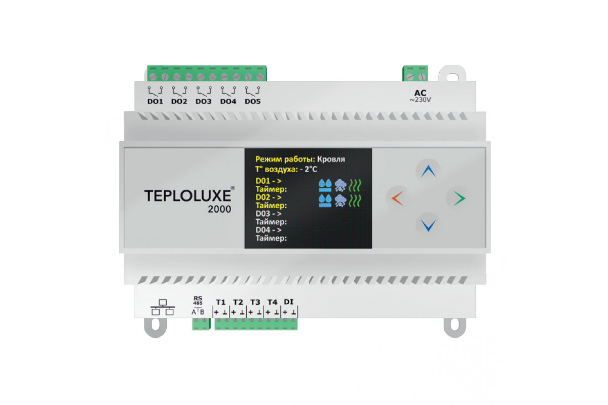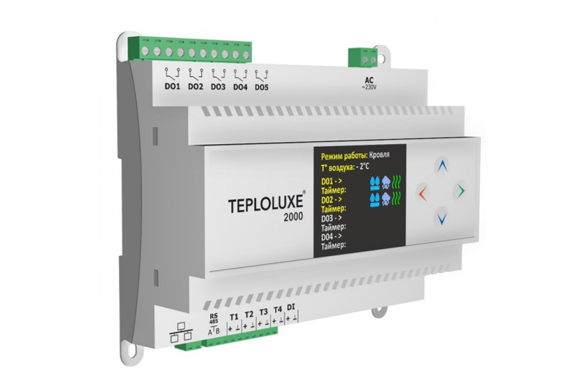 Контроллер Teploluxe 2000 используется для управления системами антиобледенения кровли и открытых площадок, обогрева трубопроводов и резервуаров, а также системами обогрева помещений (электрическими нагревательными кабелями, плёночными и другими электронагревателями).