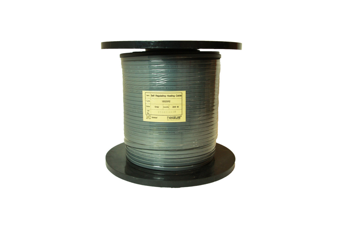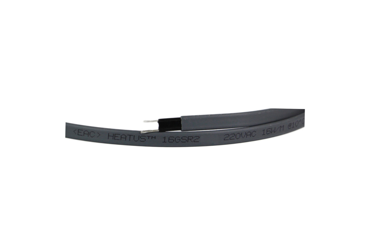 Греющий кабель Heatus 16GSR2 мощностью 16 Вт/м, неэкранированный. Полупроводниковая саморегулирующаяся матрица покрыта никелем, ее размер: 8 х 2,1 мм. Размер первой изоляции из огнестойкого полиолефина: 9,6 x 3,7. Сечение токоведущей жилы 1,11 кв. мм.