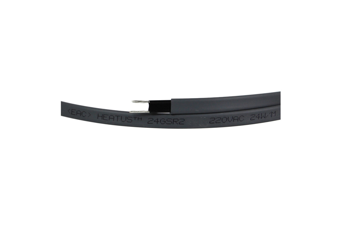 Греющий кабель Heatus 24GSR2 мощностью 24 Вт/м, неэкранированный. Полупроводниковая саморегулирующаяся матрица покрыта никелем, ее размер: 8 х 2,1 мм. Размер первой изоляции из огнестойкого полиолефина: 9,6 x 3,7. Сечение токоведущей жилы 1,11 кв. мм.