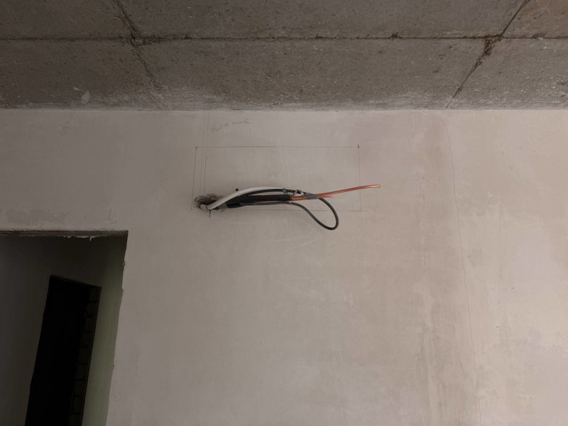 Поскольку объект находился на стадии чернового ремонта, была проведена закладка трассы под будущую сплит-систему для помещения площадью 25 квадратных метров. Такой подход — единственно правильный, если заказчик хочет получить: