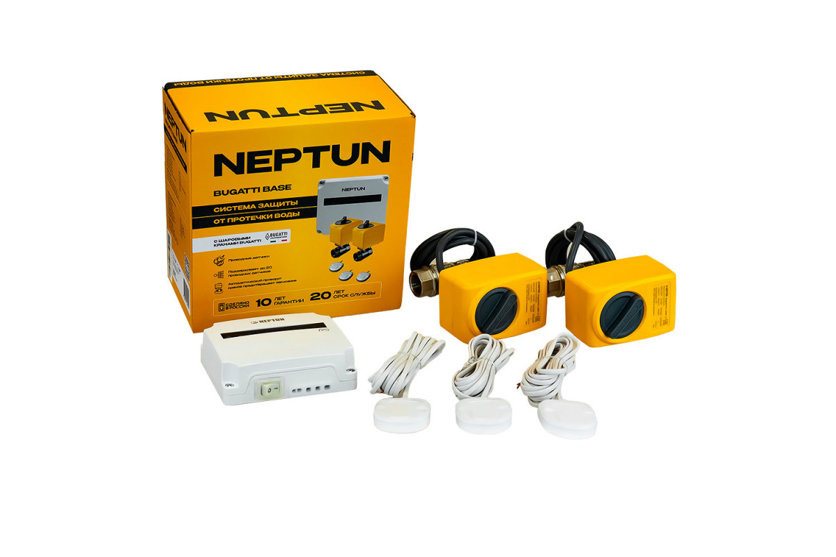 Neptun Bugatti Base - это лучшее соотношение цены и качества. Модуль управления Neptun Base - простое, но при этом очень надежное устройство. Дополнительных функций не много, но если они Вам и не нужны, то это идеальное решение. Главное, что в комплекте идут зарекомендовавшие себя шаровые краны Neptun Bugatti, которые едут напрямую с завода в Италии. У электропривода большое усилие (ломает карандаши), которое никогда не будет лишним с учетом не очень качественной водоподготовки в России, в кране используются самые лучшие уплотнительные материалы (первичный фторопласт, который выдерживает даже серную кислоту) и конечно же - есть ручное аварийное открывание на случай, если не будет питания или электроника выйдет из строя.